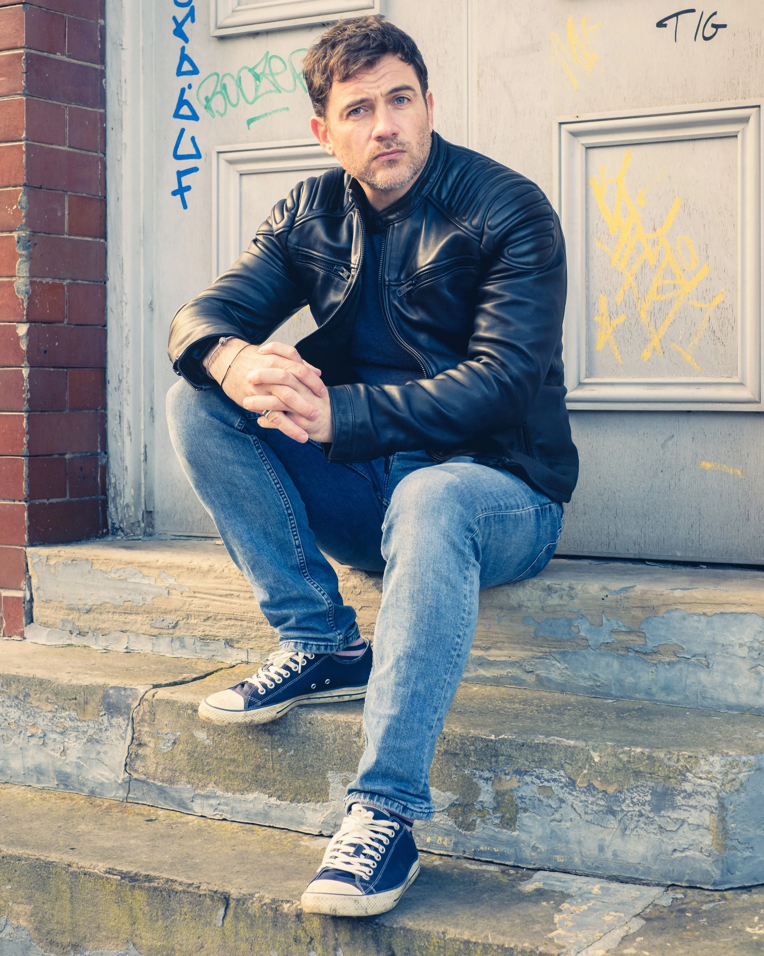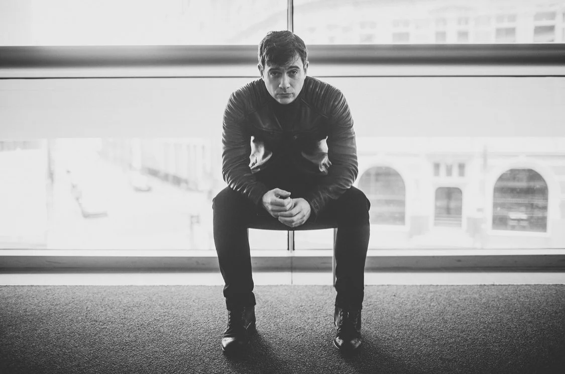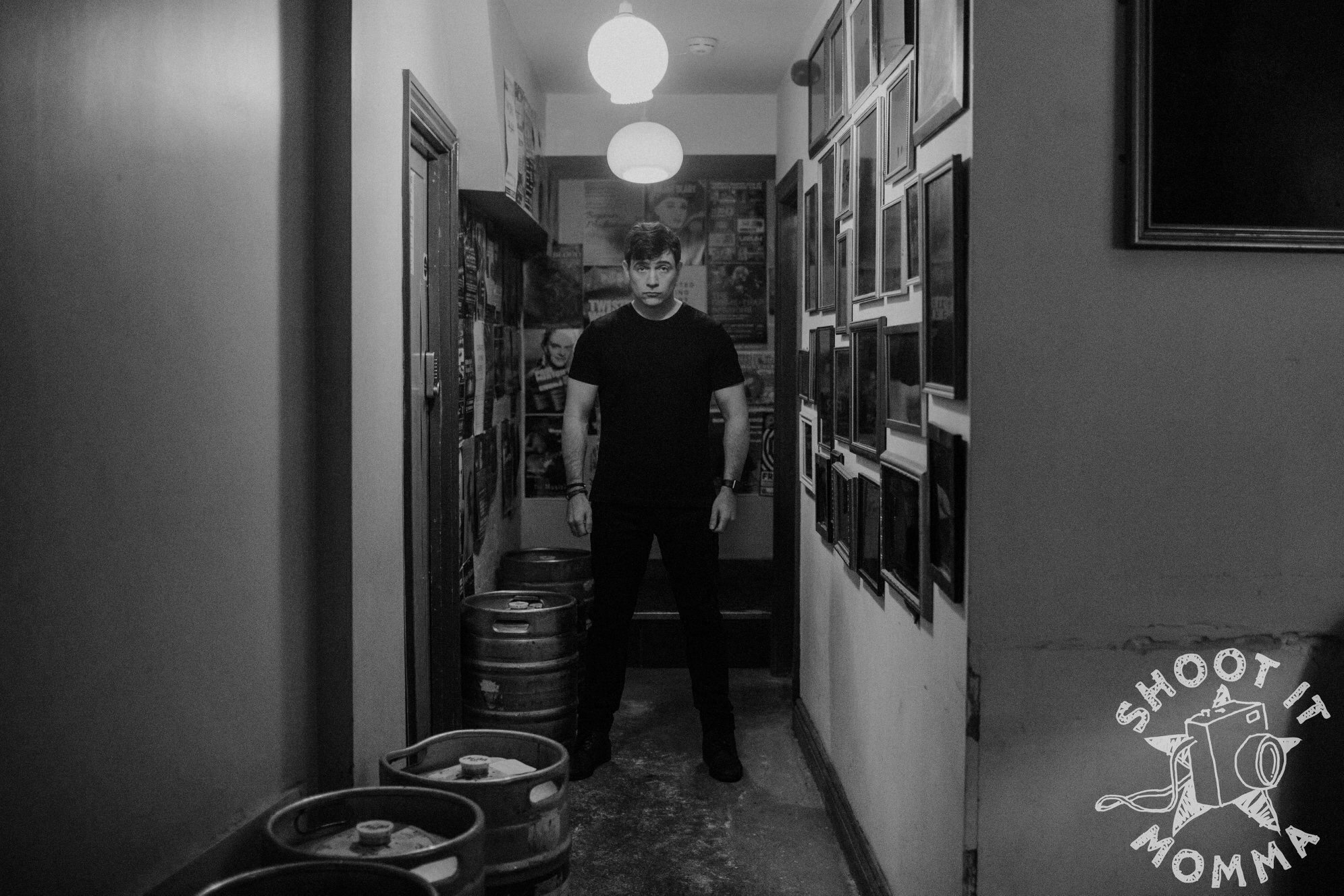 Black and white photo of a man standing in a narrow hallway with kegs and framed pictures on the walls.