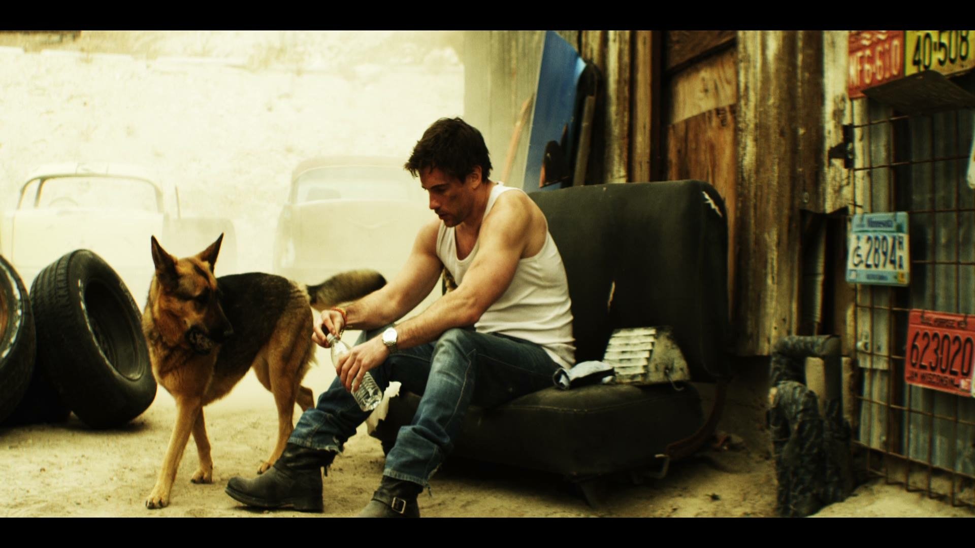 Man in a white tank top sitting on a black couch in a rustic garage setting with a German Shepherd dog, surrounded by old tires and vintage license plates.