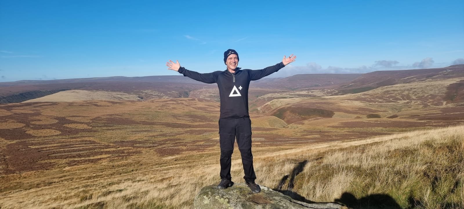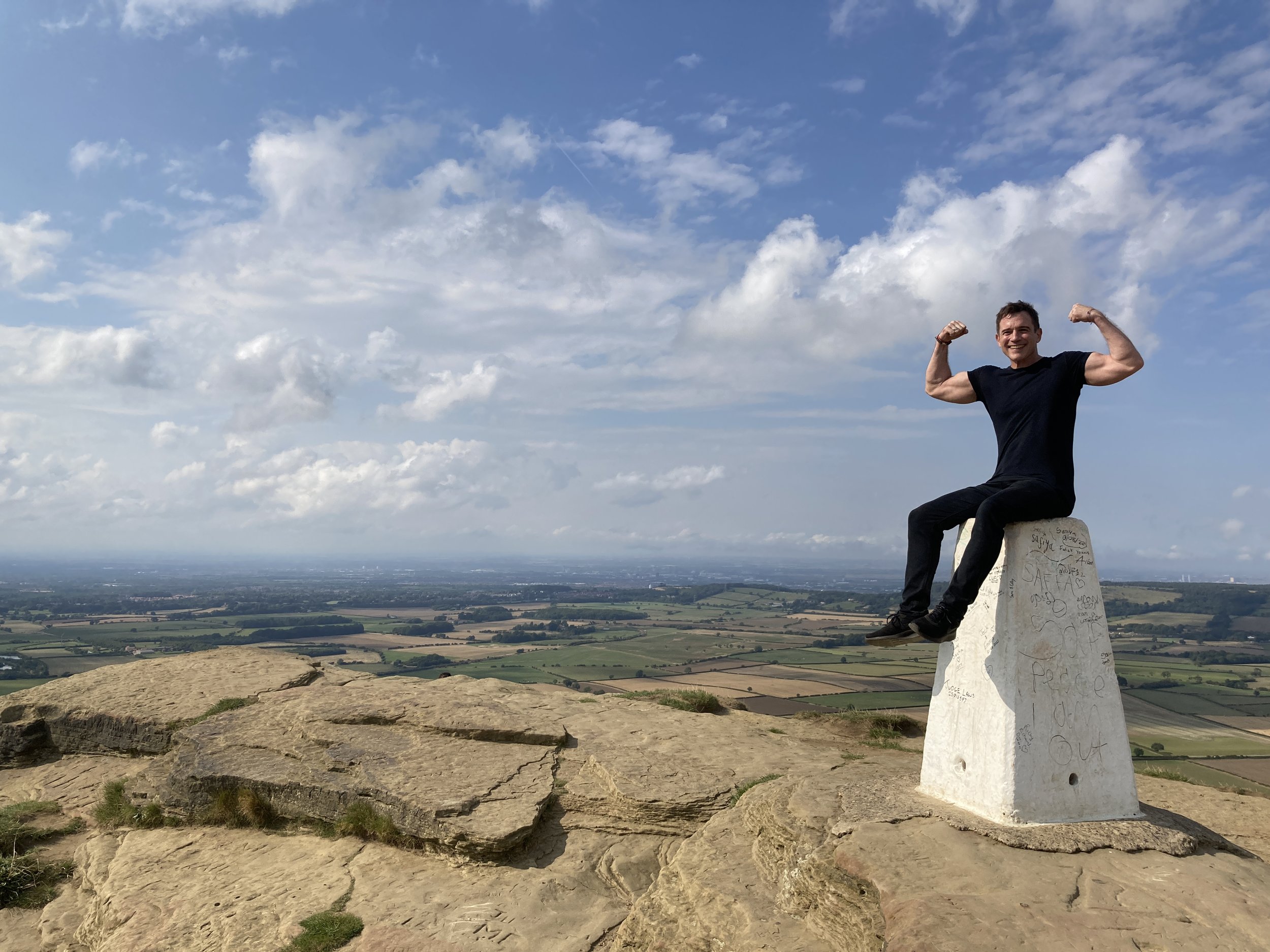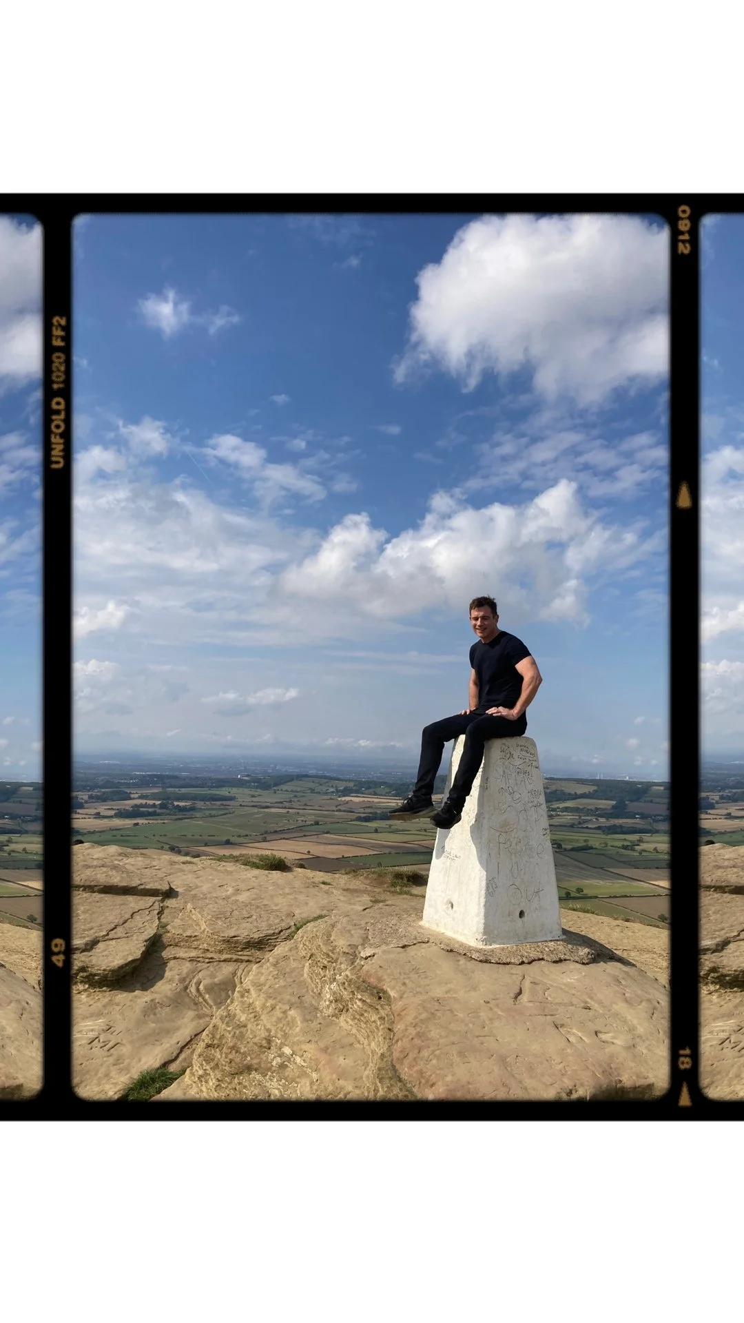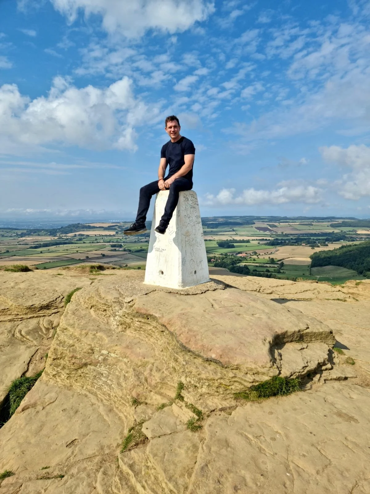 Person sitting on a trig point on a rocky hilltop with a panoramic rural landscape in the background under a blue sky with scattered clouds.