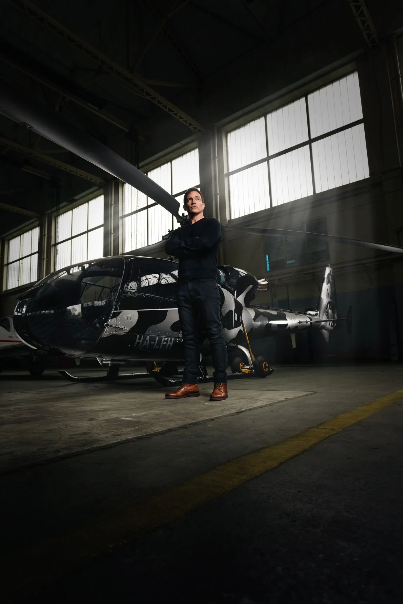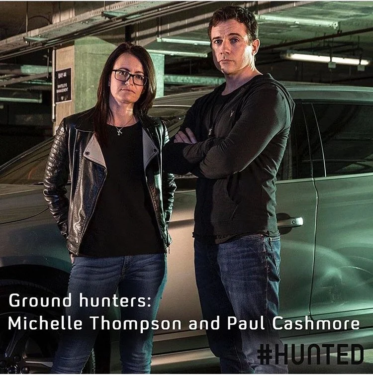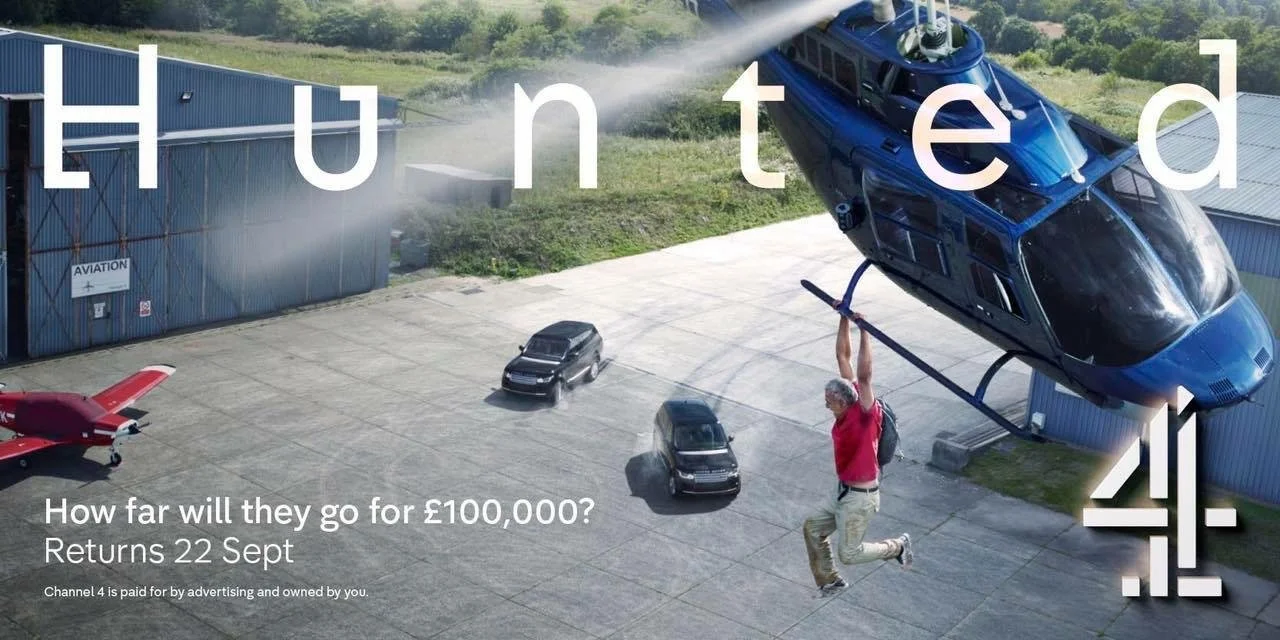 Man hanging from helicopter on runway, promotional image for 'Hunted' TV show with text about returning on September 22. Channel 4 logo visible.