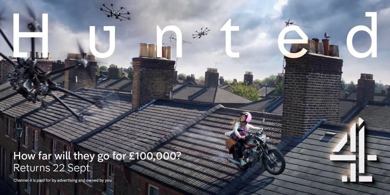 Promotional poster for 'Hunted' with drones and motorcycle on rooftops, airing September 22 on Channel 4.