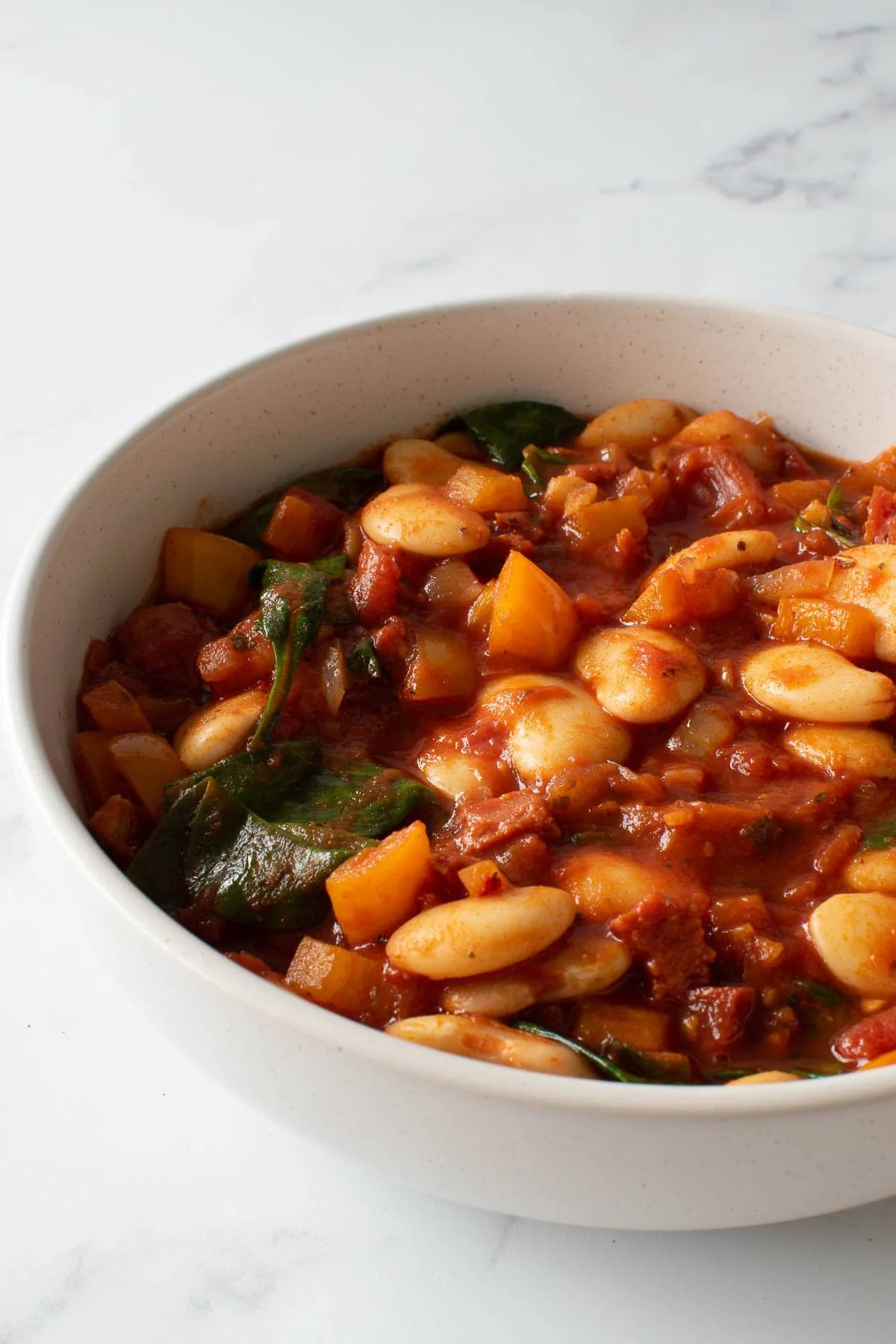 A hearty stew to feed a family with just four ingredients. Spicy chorizo and fresh pesto provide tons of flavour and it's on the table in just 20 minutes