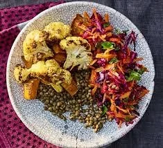 Divide the lentil mixture between four bowls (or four containers if saving and chilling). Top each serving with a quarter of the carrot slaw and a quarter of the sweet potato and cauliflower mix.